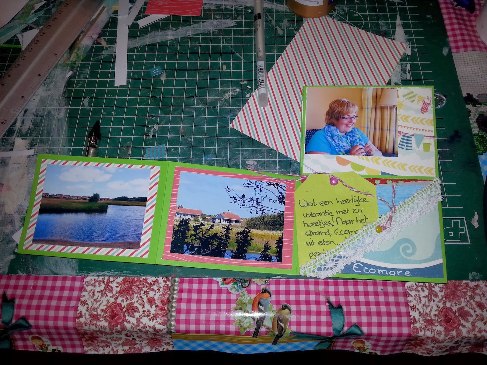 I used the designpaper "Ad Lib" from Bobunny. The background I crafted with gesso, stamps, templates, distress ink, stains and modelling paste and I made it al little bit rough. The round embellisment is a frame with designpaper, the flower was made by myself (from babytwipes :) ) and a iron heart finnished the LO. Around the LO I draw a line with white and brown fineliner